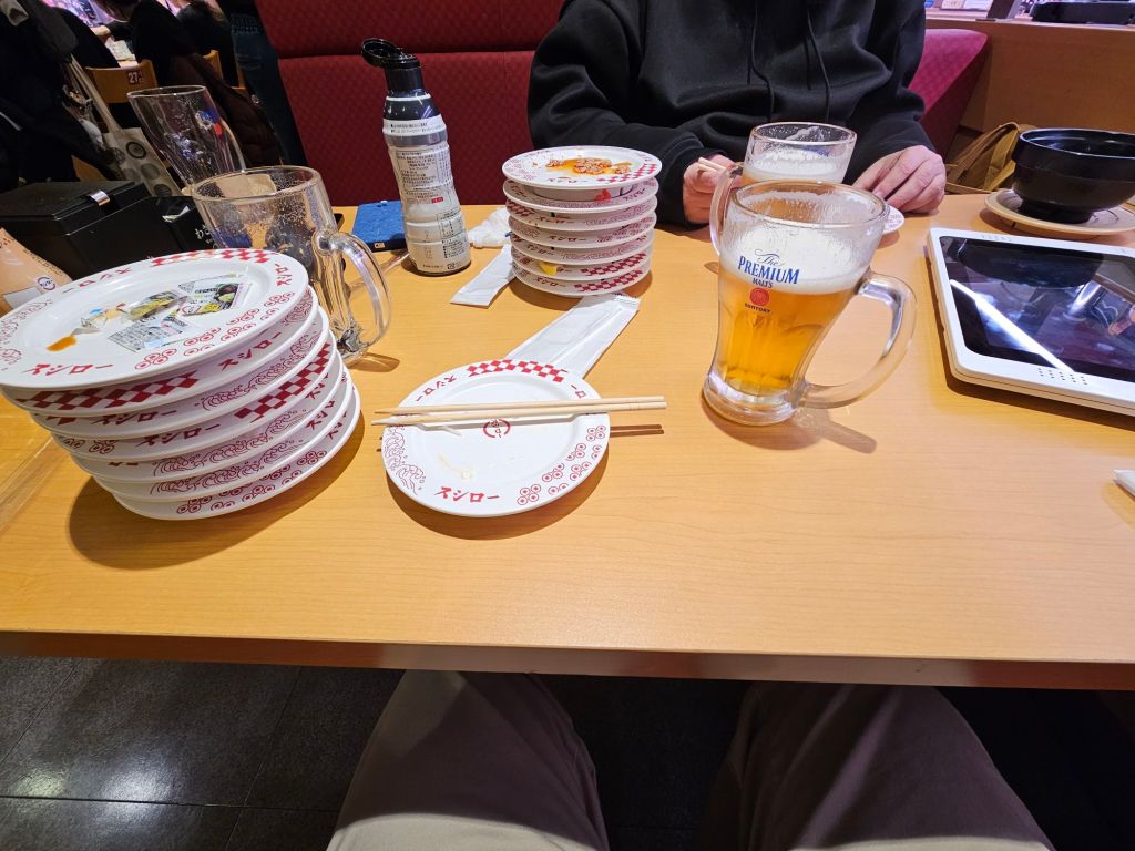 After a short break, we ventured through the adjacent temple grounds over to a conveyor belt sushi place. It was interesting how that worked. You order up to 4 plates (2-3 pieces of sushi) at a time, and then they show up on the top conveyor lane next to you. The lower lane rotating conveyor part was just used for advertisements and condiments. Beer was delivered the same way.
